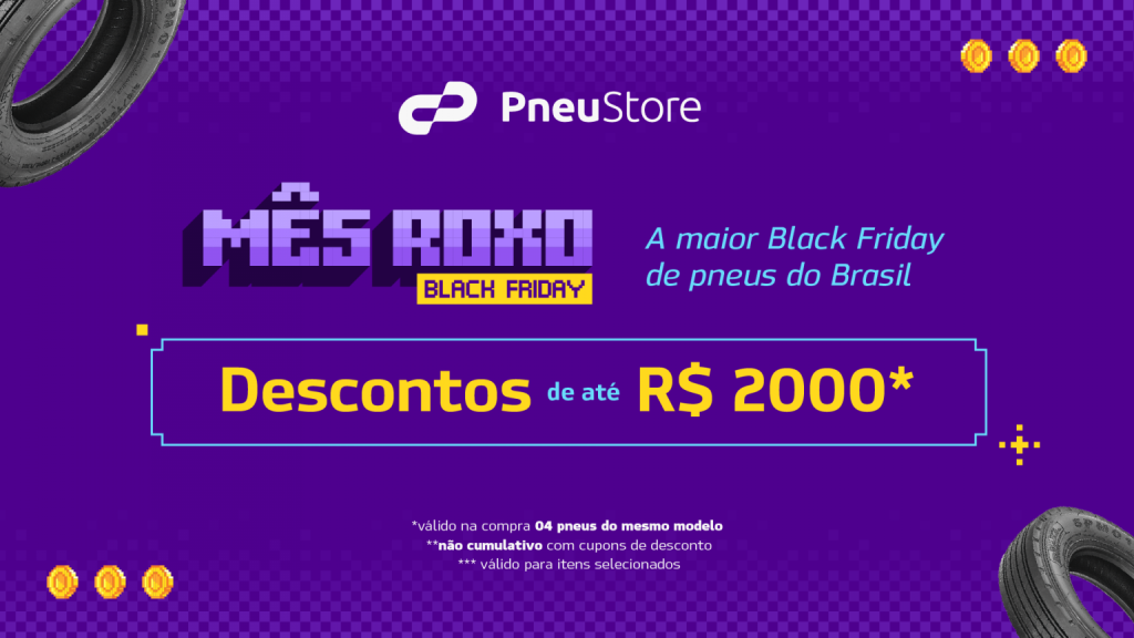 O Mês Roxo é a campanha promocional de Black Friday da PneuStore que acontece no mês de novembro. Durante o “Mês Roxo”, os clientes têm a oportunidade de adquirir pneus de diferentes marcas e modelos com preços reduzidos. Além disso, no mesmo período também é possível aproveitar outros benefícios, como frete grátis em produtos selecionados, parcelamento facilitado e descontos extras para pagamento no pix.